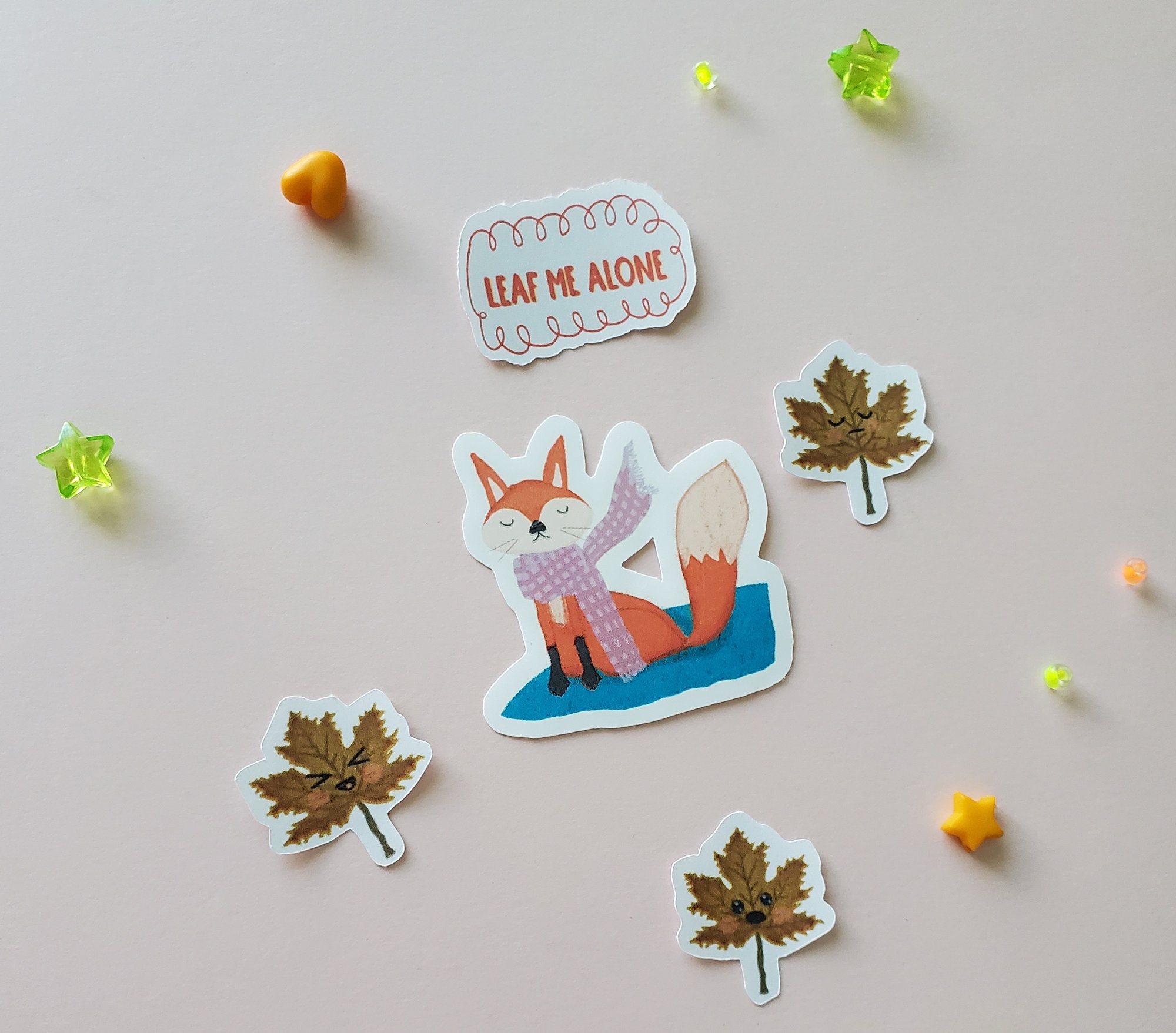These are premium matte vinyl stickers. This sticker pack includes 5 stickers. Sleepy Fox, 3 of his leaf friends, a leaf me alone sticker and a mini print freebie are all included. Oh my gosh, I had so much fun making these stickers and pretty much had the giggles while I drew them. Lol